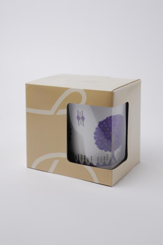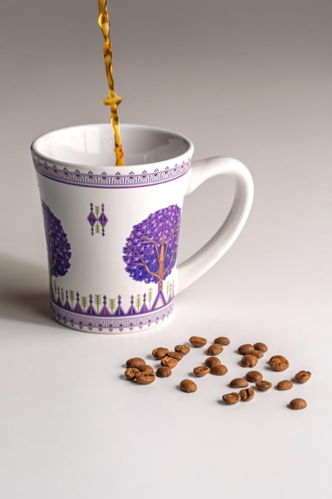 الألوان البنفسجية الهادئة تلتقي بالأبيض الناصع لتمنح الكوب أناقة لافتة ولمسة من الانتماء.