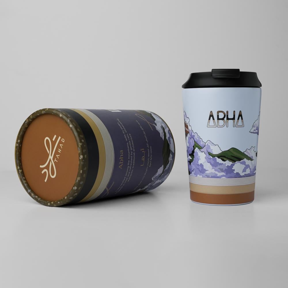 95.65350ml stainless steel mug with Abha landscape design. Double-wall insulated, leak-proof, and travel-friendly.